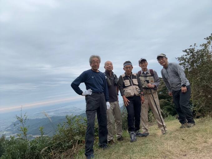 宮路山·五井山登山 (担当:S57鈴木公敏) 出発前に駐車場に到着したら、赤いネクタイ(登山者ではないな)の男性が車から降りてきました、なんと神谷議員ではないですか!わざわざ登山応援に来てくれました。LINEに写真と動画も配信、ありがとうm(_